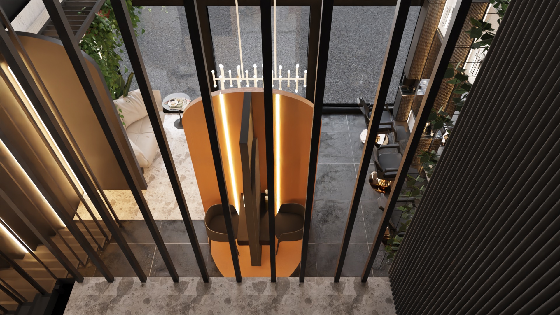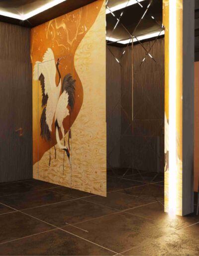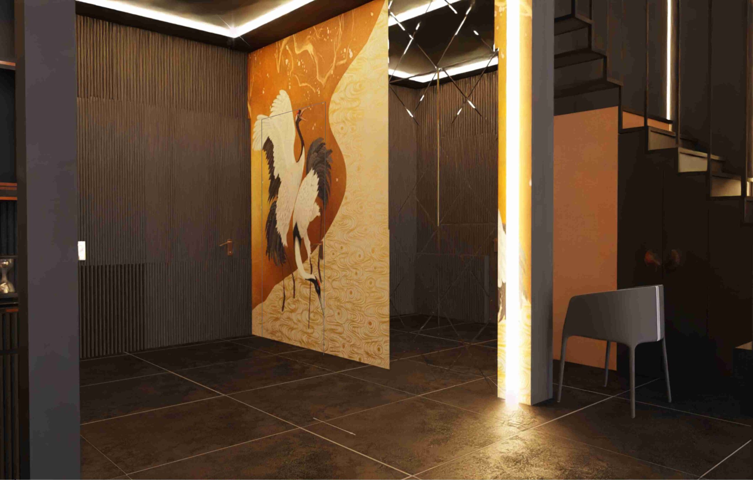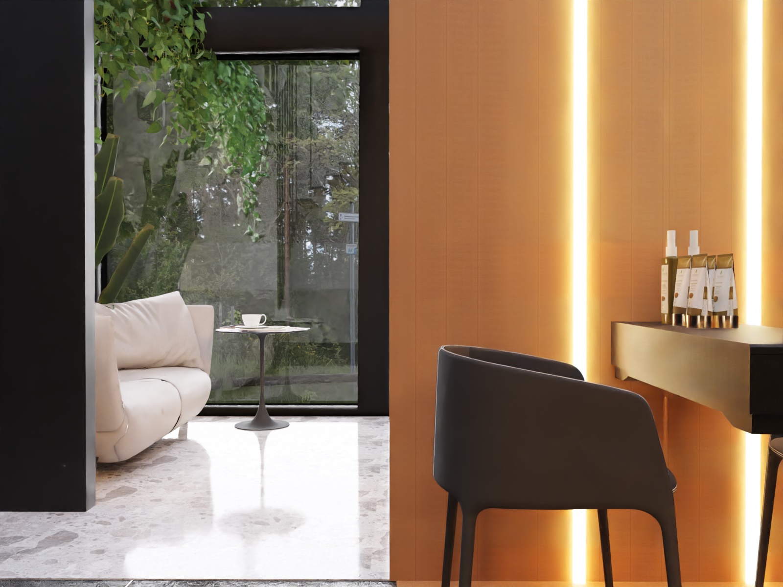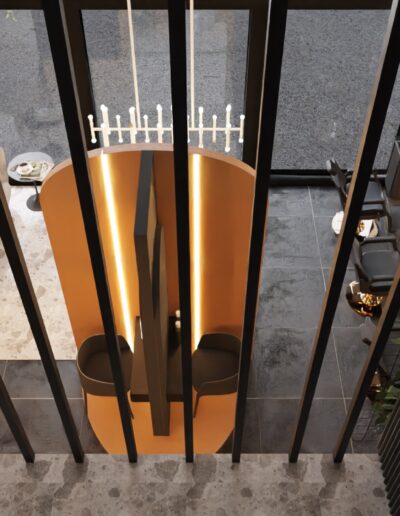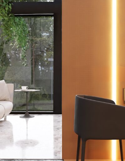 Główną koncepcją tego projektu była elegancja. Kolorystyka oparta na głębokiej czerni i szlachetnym złocie tworzy atmosferę luksusu i ekskluzywności. To jak wizja artysty, gdzie każdy szczegół ma znaczenie i razem tworzą całość, która mówi o stylu i wyrafinowaniu. Jednakże, aby dodać wyrazistości tej palety kolorów, postanowiliśmy wprowadzić subtelny akcent kolorystyczny. To właśnie ten element dodaje energii i radości, czyniąc wnętrze jeszcze bardziej przyjaznym i otwartym. To jak oddech świeżego powietrza, który ożywia całą przestrzeń.