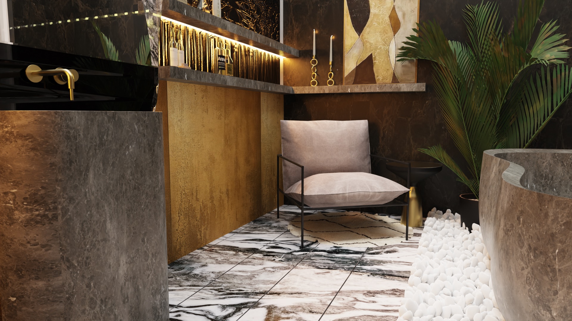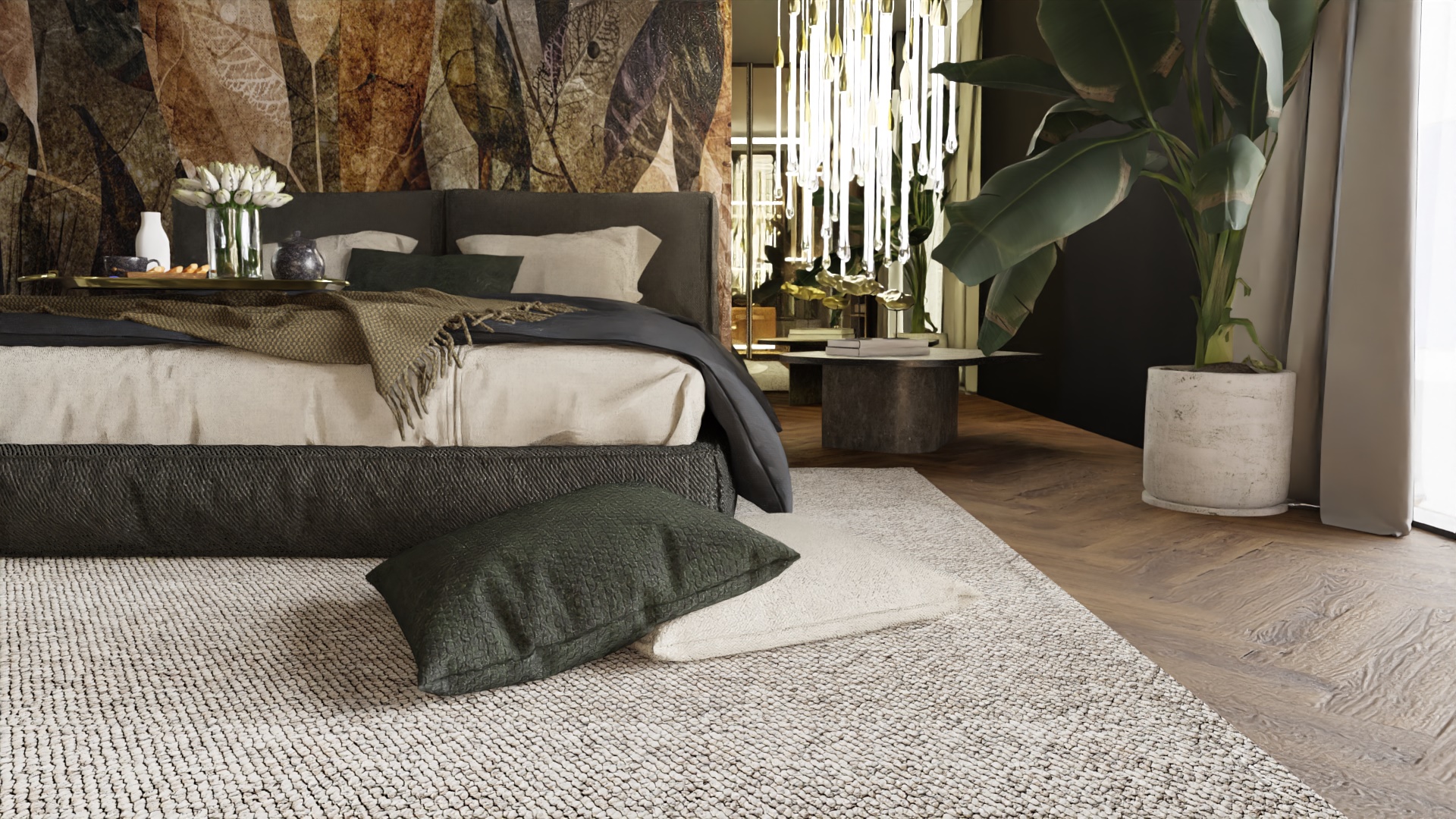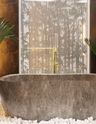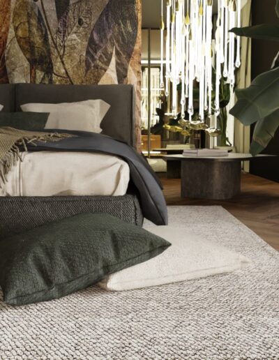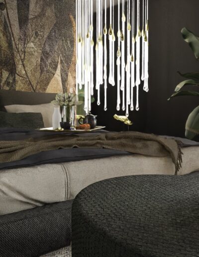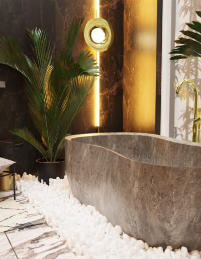 Rozpoczęliśmy od funkcjonalności, której priorytetem było stworzenie miejsca idealnego zarówno dla wypoczynku, jak i przyjmowania gości. Przemyślane układy pomieszczeń, takie jak przestronny salon, kuchnia z jadalnią, elegancki hol oraz łazienka, zapewniają komfortowe warunki codziennego życia. Jednym z wyjątkowych elementów tego projektu jest sypialnia, która została harmonijnie połączona z przestronnym salonem kąpielowym oraz dużą garderobą. To przemyślane rozwiązanie nie tylko podkreśla luksus wnętrza, ale również spełnia potrzeby prywatności i wygody.