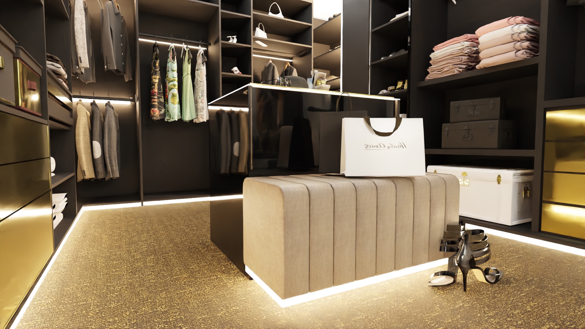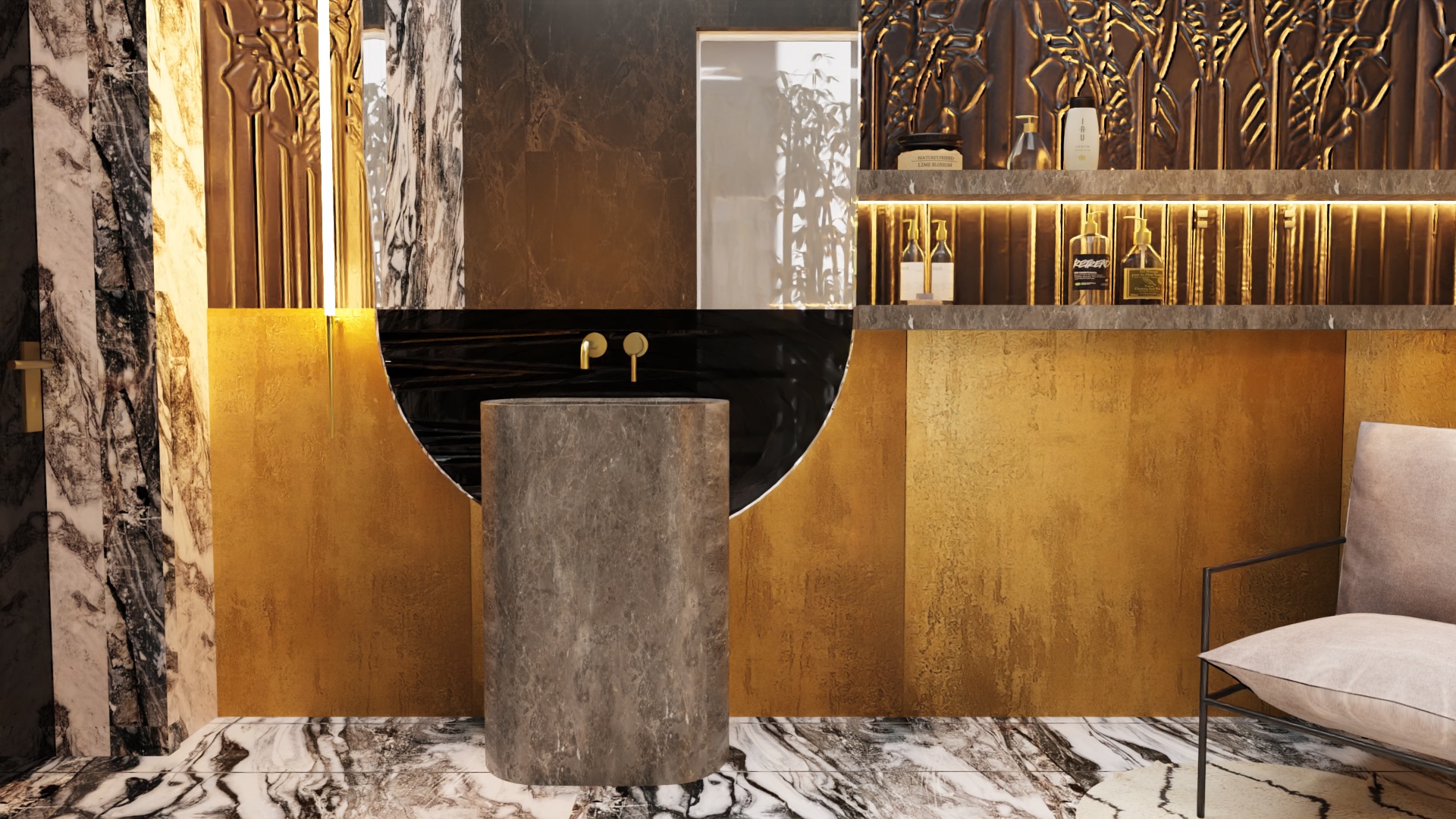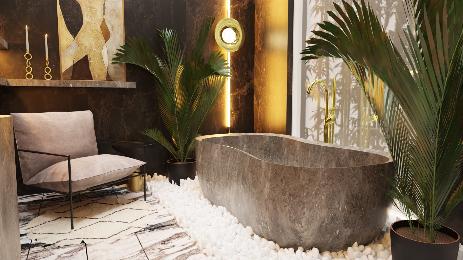 Rozpoczęliśmy od funkcjonalności, której priorytetem było stworzenie miejsca idealnego zarówno dla wypoczynku, jak i przyjmowania gości. Przemyślane układy pomieszczeń, takie jak przestronny salon, kuchnia z jadalnią, elegancki hol oraz łazienka, zapewniają komfortowe warunki codziennego życia. Jednym z wyjątkowych elementów tego projektu jest sypialnia, która została harmonijnie połączona z przestronnym salonem kąpielowym oraz dużą garderobą. To przemyślane rozwiązanie nie tylko podkreśla luksus wnętrza, ale również spełnia potrzeby prywatności i wygody.