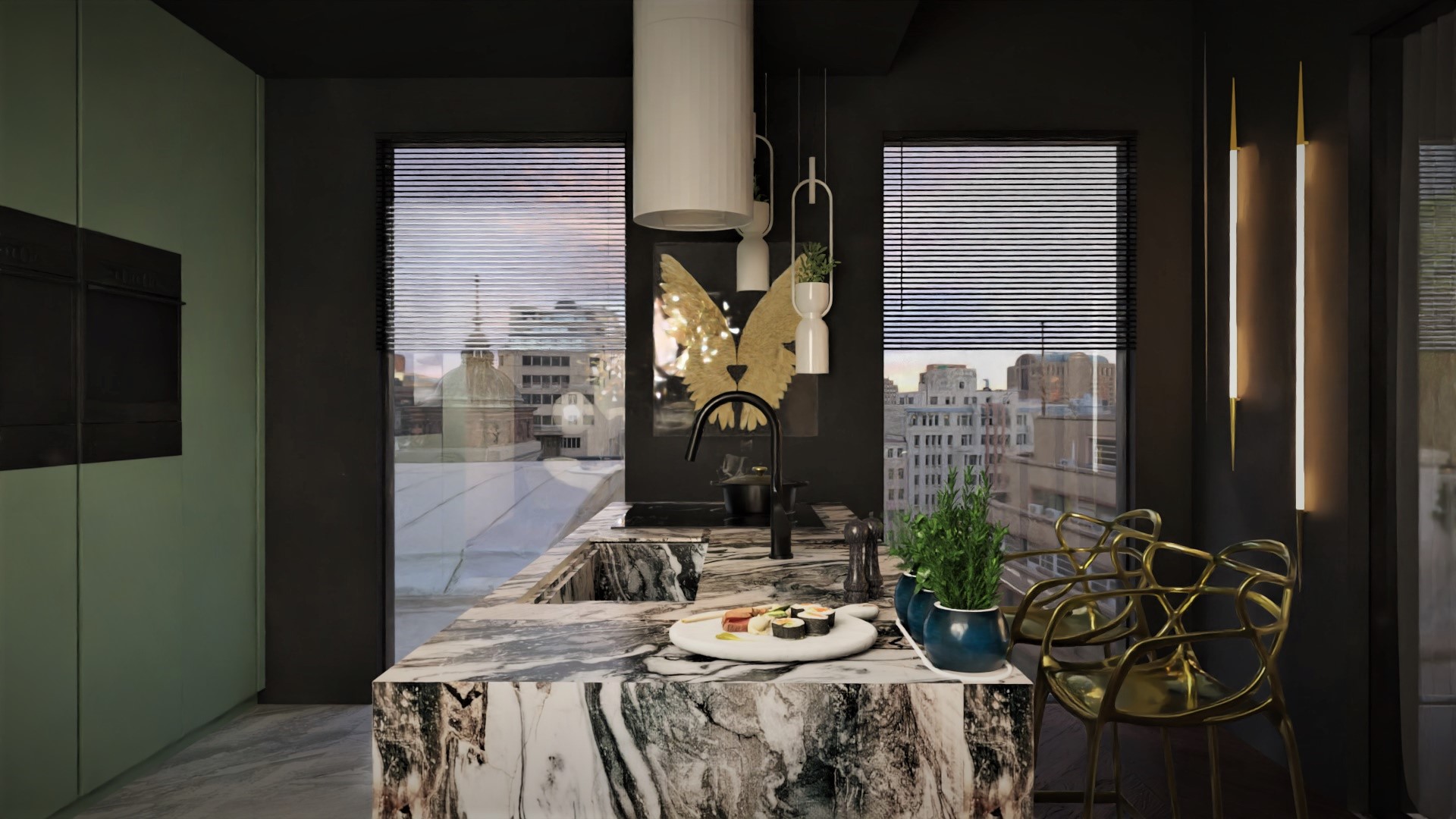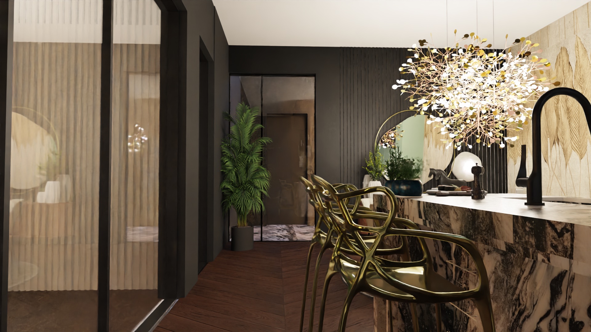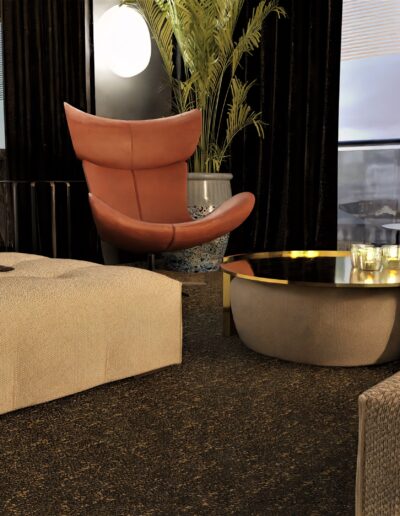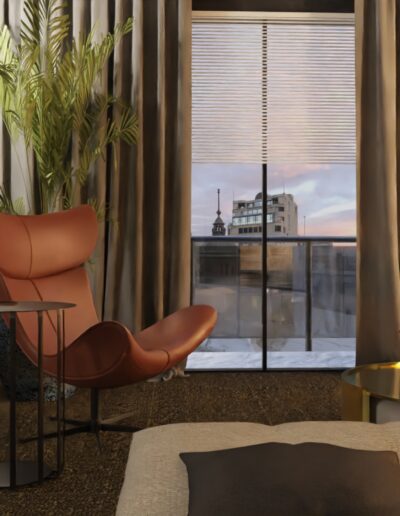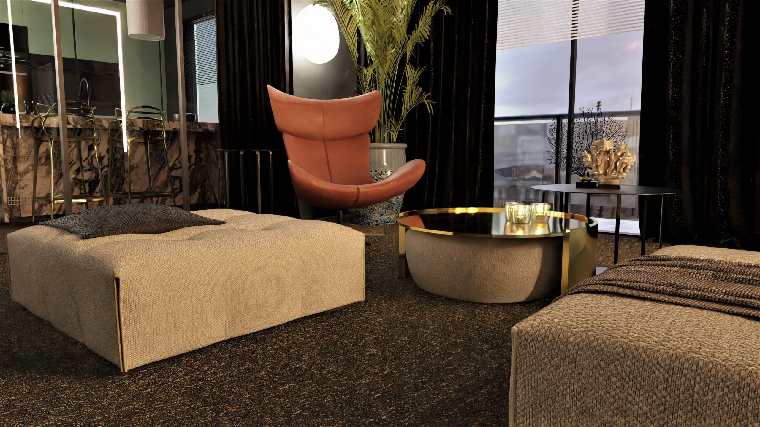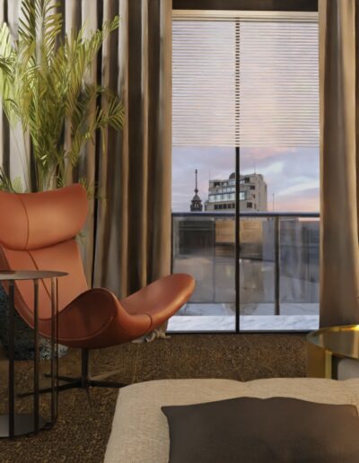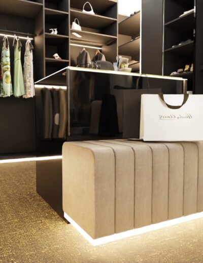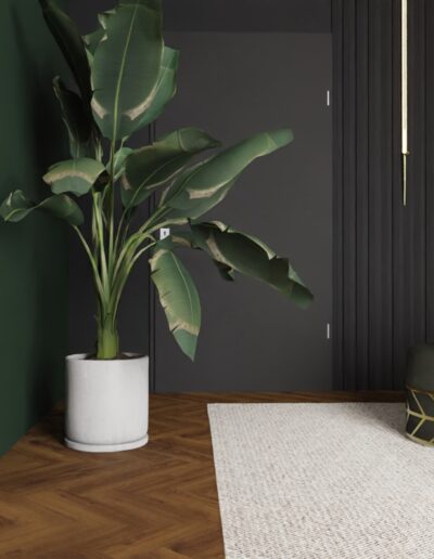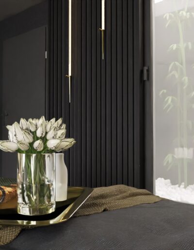 Równie istotnym aspektem była lokalizacja gabinetu. Zrozumieliśmy, że elastyczność pracy zdalnej jest nieodzowna w dzisiejszym świecie. Dlatego zaprojektowaliśmy eleganckie i ergonomiczne miejsce do pracy, które jednocześnie harmonijnie wpisuje się w całość aranżacji. Nie zapomnieliśmy również o wizerunku tego apartamentu. Stworzyliśmy klimat miejski, emanujący elegancją i nowoczesnością. Dominujące ciemne barwy kontrastują z jasnymi akcentami, tworząc wyjątkową atmosferę, która odzwierciedla charakter Warszawy.