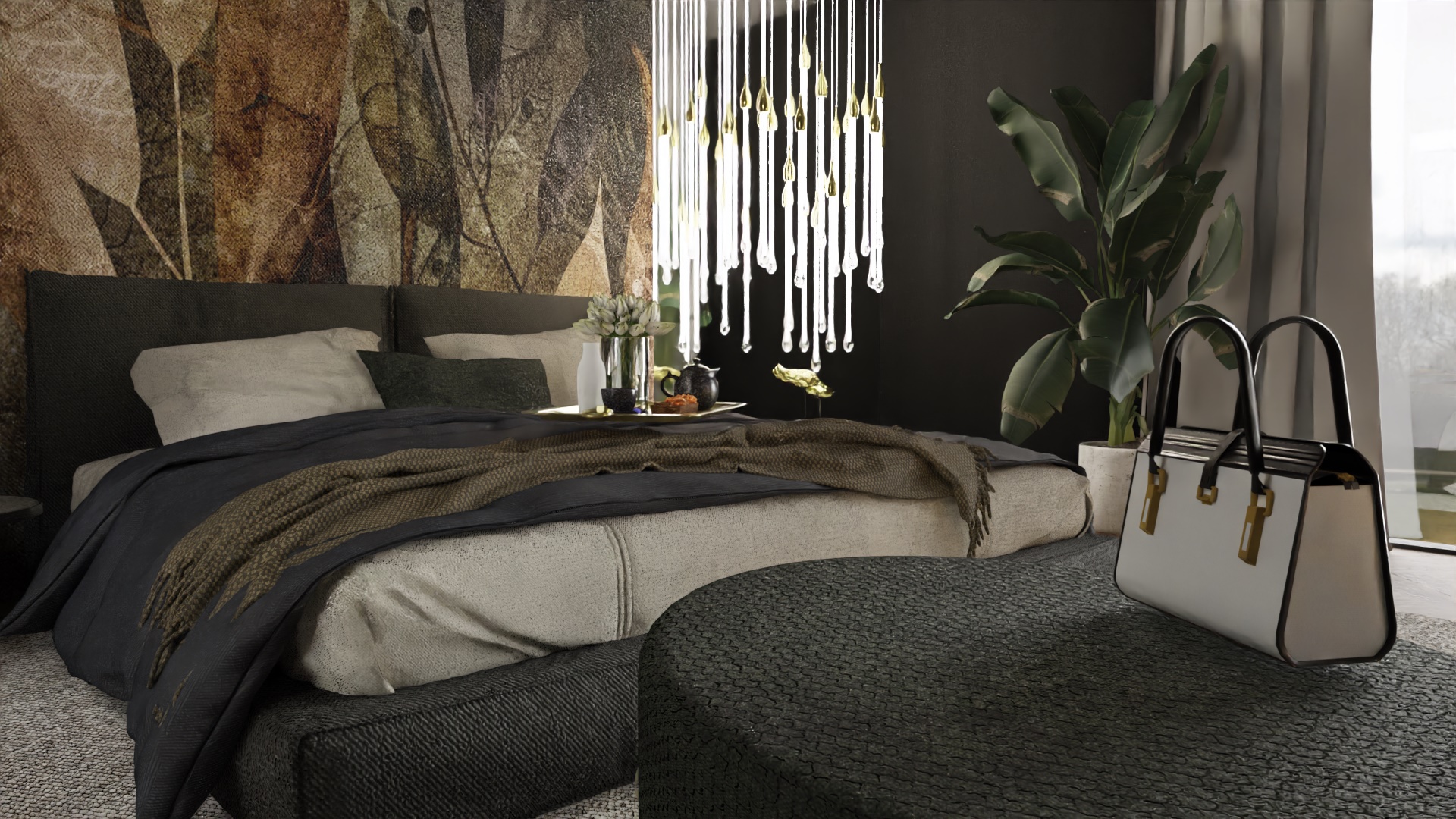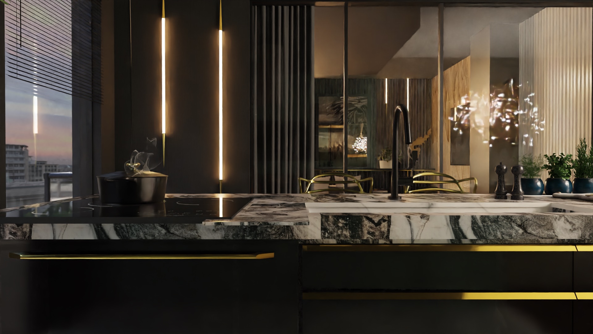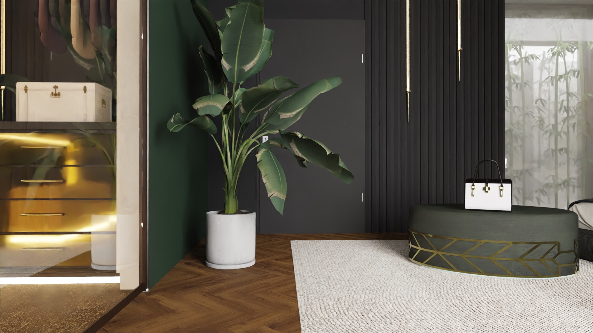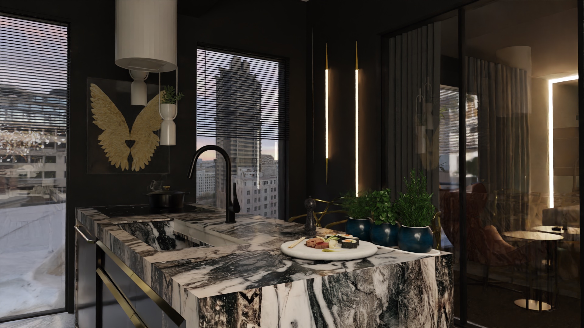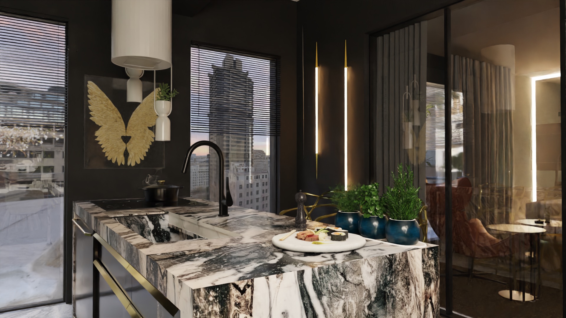 Równie istotnym aspektem była lokalizacja gabinetu. Zrozumieliśmy, że elastyczność pracy zdalnej jest nieodzowna w dzisiejszym świecie. Dlatego zaprojektowaliśmy eleganckie i ergonomiczne miejsce do pracy, które jednocześnie harmonijnie wpisuje się w całość aranżacji. Nie zapomnieliśmy również o wizerunku tego apartamentu. Stworzyliśmy klimat miejski, emanujący elegancją i nowoczesnością. Dominujące ciemne barwy kontrastują z jasnymi akcentami, tworząc wyjątkową atmosferę, która odzwierciedla charakter Warszawy.