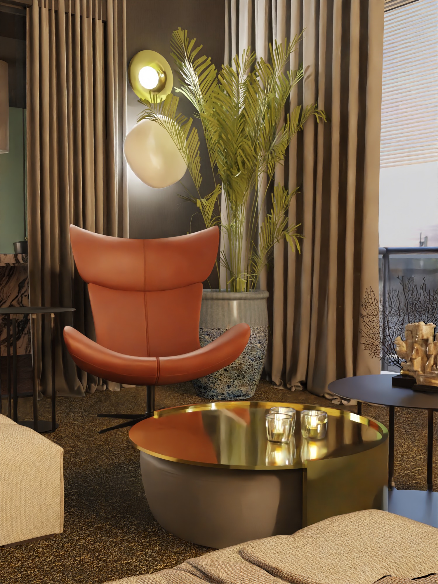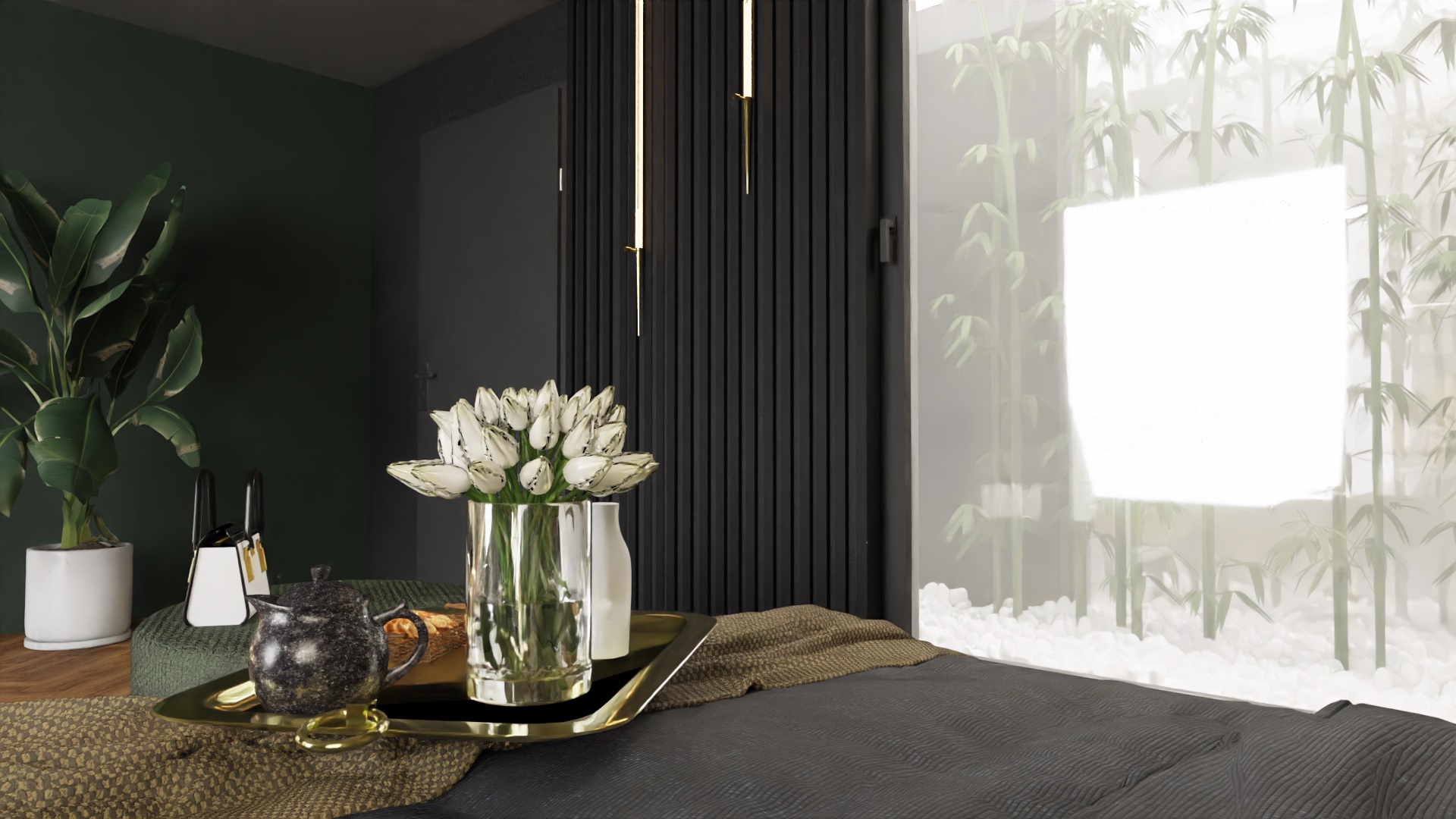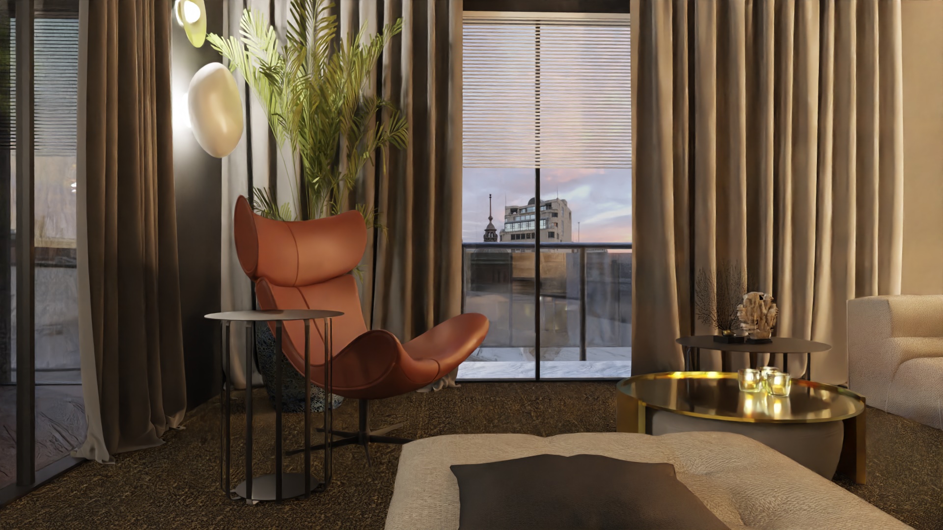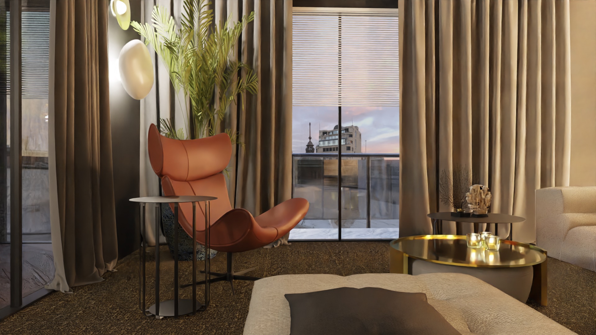 Równie istotnym aspektem była lokalizacja gabinetu. Zrozumieliśmy, że elastyczność pracy zdalnej jest nieodzowna w dzisiejszym świecie. Dlatego zaprojektowaliśmy eleganckie i ergonomiczne miejsce do pracy, które jednocześnie harmonijnie wpisuje się w całość aranżacji. Nie zapomnieliśmy również o wizerunku tego apartamentu. Stworzyliśmy klimat miejski, emanujący elegancją i nowoczesnością. Dominujące ciemne barwy kontrastują z jasnymi akcentami, tworząc wyjątkową atmosferę, która odzwierciedla charakter Warszawy.