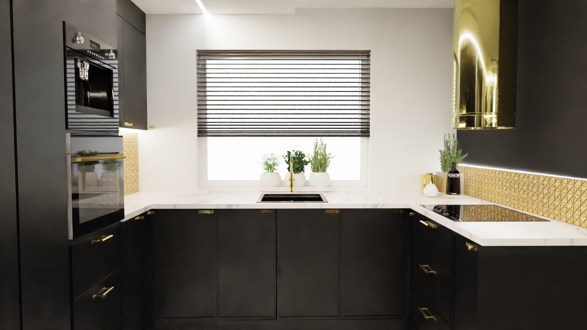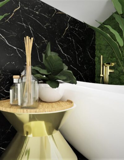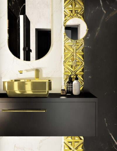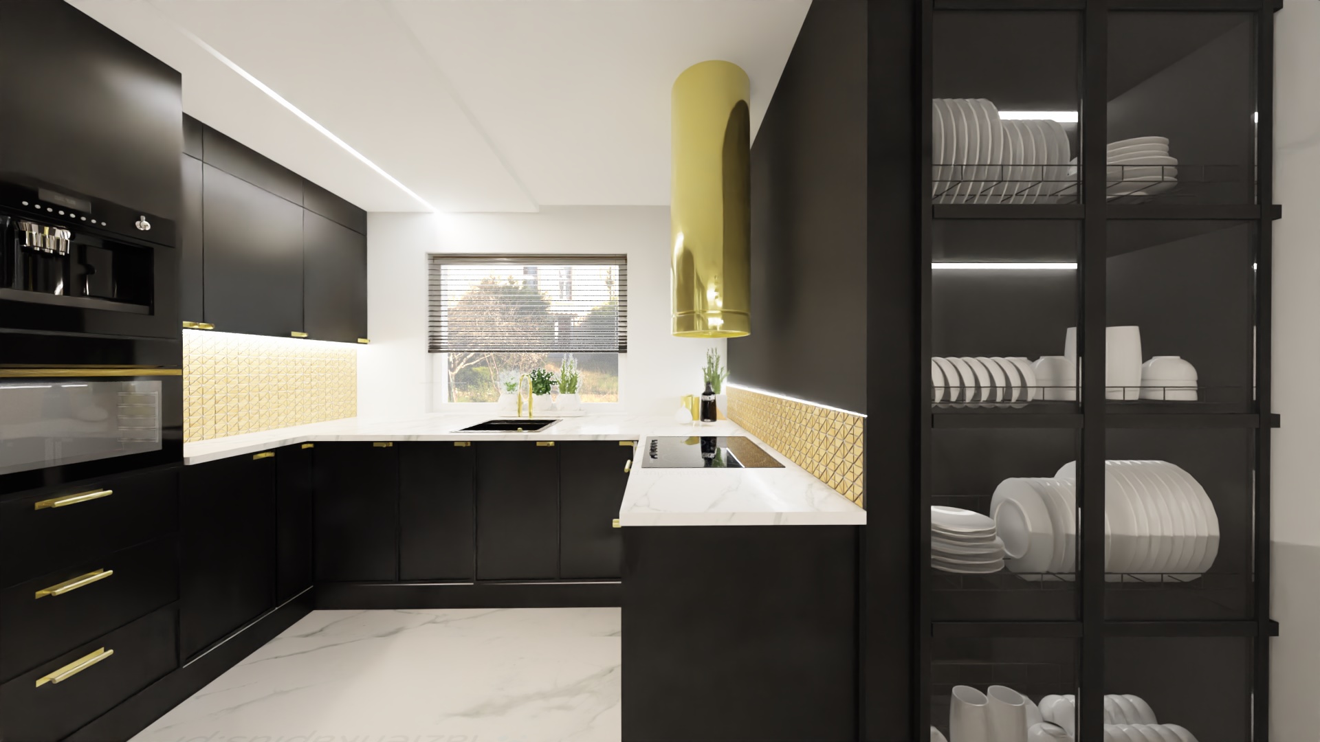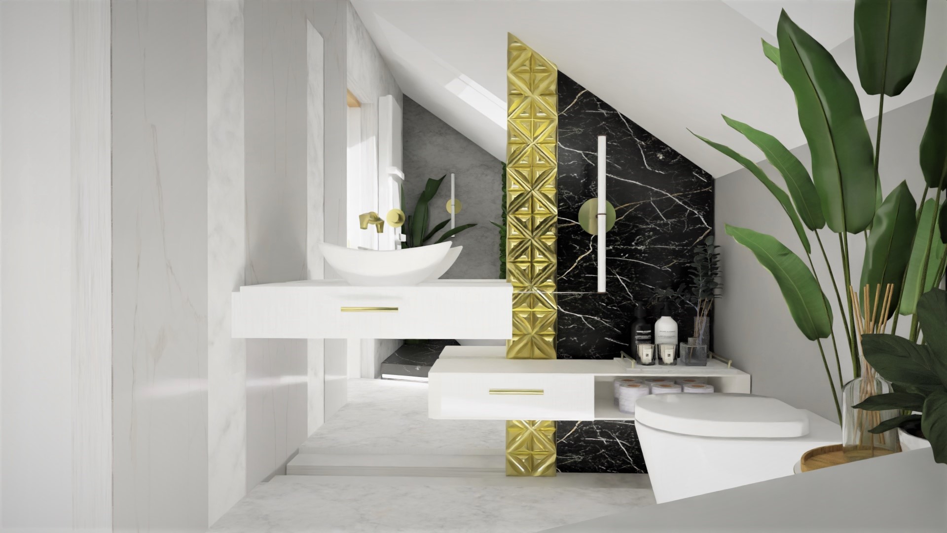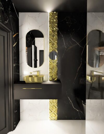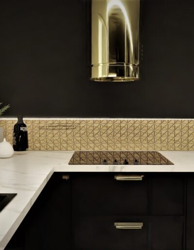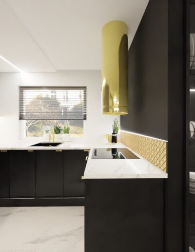 Projekt ten, którego w pełni konsekwentnie wcielam w życie w całym domu, to zbiór starannie dobranych elementów, tworzących spójny, harmonijny obraz. Wybór odważnej kolorystyki był efektem spełnienia życzeń klientów, którzy pragnęli wyrafinowanego wnętrza, pozbawionego przesadnych ozdob. W mojej pracy zawsze stawiam na poszukiwanie nowych rozwiązań, by stworzyć coś niepowtarzalnego. Szczególnie niezwykła jest aranżacja klatki schodowej, która pełni kluczową rolę jako integralna część domu. W projekcie wnetrza domu jednorodzinnego w Chechle, zaproponowałam fascynującą aranżację klatki schodowej. Złota mozaika, współgrająca z okapem od Globalo, tworzy niezapomniany efekt wizualny, nadając przestrzeni niepowtarzalny charakter. Kiedy przychodzi do barierki schodów, moje podejście jest otwarte na różnorodność. W projekcie zdecydowałam się na innowacyjne rozwiązanie – metalowe, złote pręty. Taki element wprowadza świeżość i nowoczesność, podkreślając jednocześnie elegancki styl całego projektu.
