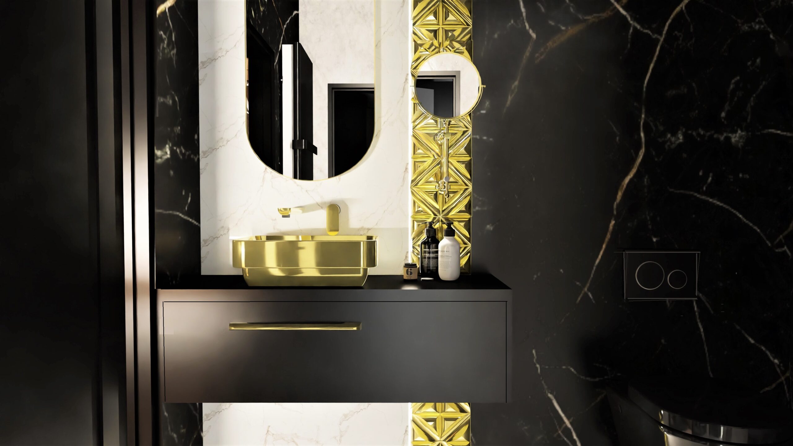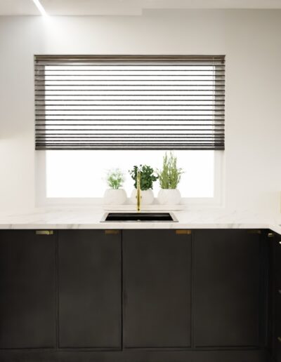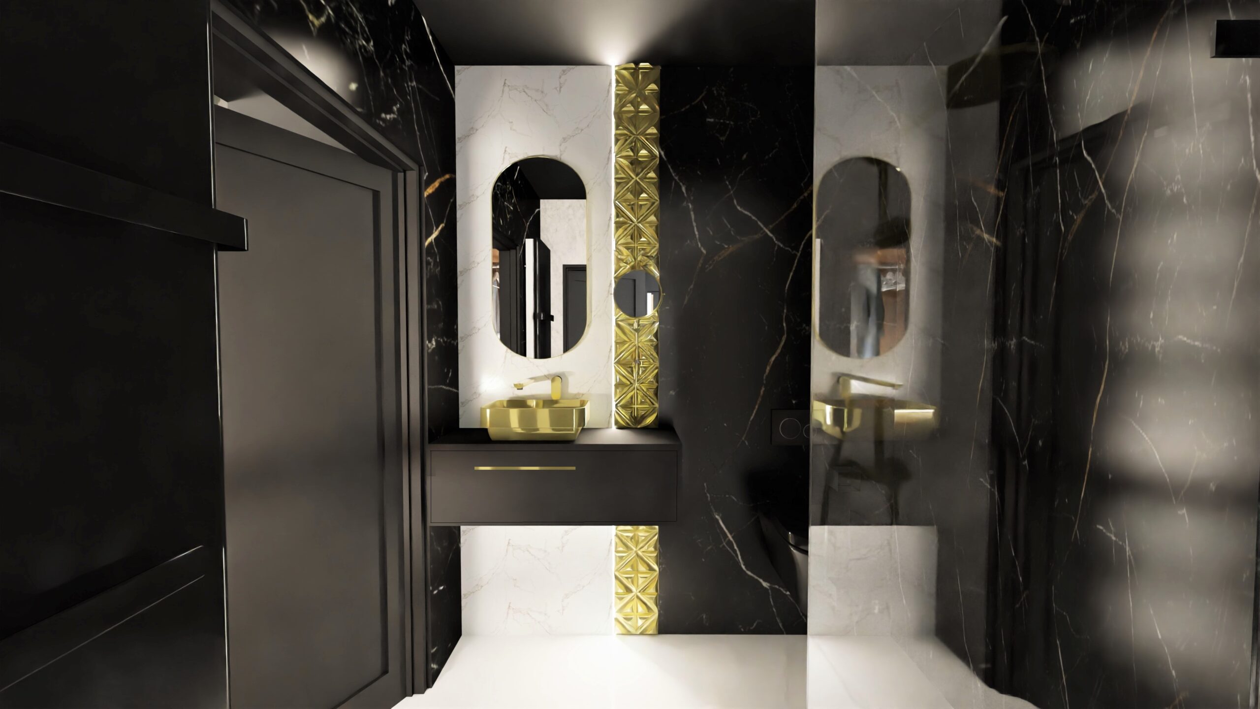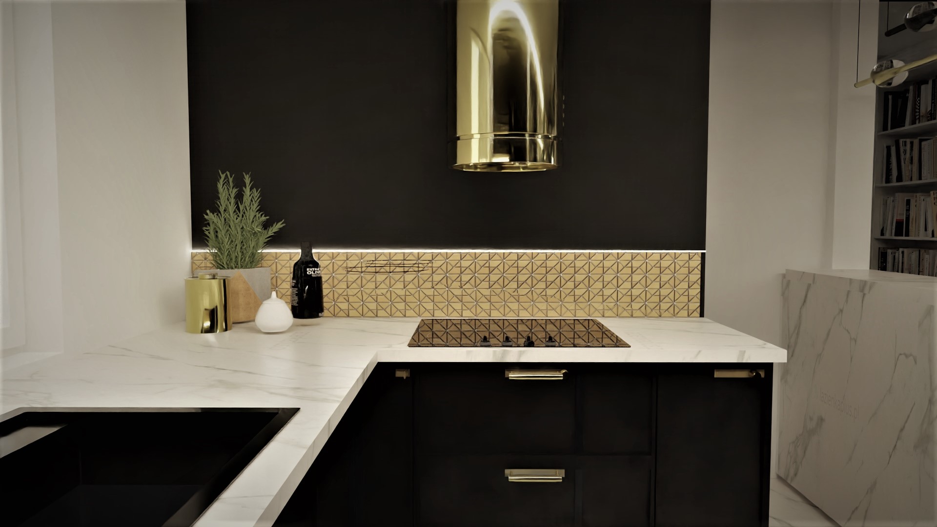 Projekt ten, którego w pełni konsekwentnie wcielam w życie w całym domu, to zbiór starannie dobranych elementów, tworzących spójny, harmonijny obraz. Wybór odważnej kolorystyki był efektem spełnienia życzeń klientów, którzy pragnęli wyrafinowanego wnętrza, pozbawionego przesadnych ozdob. W mojej pracy zawsze stawiam na poszukiwanie nowych rozwiązań, by stworzyć coś niepowtarzalnego. Szczególnie niezwykła jest aranżacja klatki schodowej, która pełni kluczową rolę jako integralna część domu. W projekcie wnetrza domu jednorodzinnego w Chechle, zaproponowałam fascynującą aranżację klatki schodowej. Złota mozaika, współgrająca z okapem od Globalo, tworzy niezapomniany efekt wizualny, nadając przestrzeni niepowtarzalny charakter. Kiedy przychodzi do barierki schodów, moje podejście jest otwarte na różnorodność. W projekcie zdecydowałam się na innowacyjne rozwiązanie – metalowe, złote pręty. Taki element wprowadza świeżość i nowoczesność, podkreślając jednocześnie elegancki styl całego projektu.